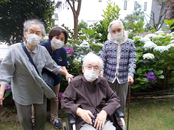 今、デイの庭には紫陽花が満開です。今年はすごいですよ。