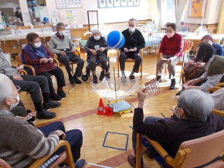 足だけでは物足りなさがあり両手も空いているので両手ではビンゴゲームをしてしまいます。ゲーム方法は中央にほんの少し浮かせて逆さにしている傘の中に通常より弾力の増した風船を足で蹴って傘の中に入れた方が職員の持っているカードを1枚引くことができます。カードにはその名のとおりビンゴの数字が一つ書いてあり、一人一枚配布したビンゴカードにその数字が一致していればその数字の場所に穴を開けていきます。縦横斜めなどビンゴに時間経過とともに蹴りまくってはカードをひき皆様ビンゴになっていきますが今回は1番ビンゴの数が多かった方が景品をもらえるゲームです。景品となると皆さんいつも以上に燃えていました!とても良いゲームになったと思います!宮崎