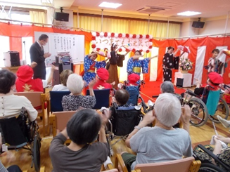 式典から始まり、イベントも鑑賞していただき、最後はデイサービスの全員で集合写真を撮りました。他にも手型の色紙に各職員からメッセージを書いてプレゼントしました。